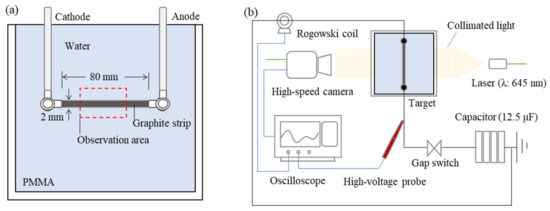 Experiments using the shadowgraph technique were conducted to visualize the explosion behavior of graphite strips under pulsed high currents. The details of the visualization target and the shadowgraph layout are shown in Figure 1. The target shown in Figure 1a consisted of a cubic polymethyl methacrylate (PMMA) water tank with a side length of 200 mm, electrodes connected to a capacitor, and graphite strips. The graphite strip was made from expanded graphite (Jinglong Special Carbon Co., Ltd., Beijing, China). First, the graphite flake powder was treated with sulfuric acid or nitric acid, followed by heating in an inert gas medium for expansion. Then, the powder was mechanically compressed to form a graphite paper structure (density: approximately 1.4 g/cm3). The cheap inert gas used for the production of graphene was N2 gas. The width, thickness, and length of the graphite strips were 2, 0.5, and 80 mm, respectively, and their weight was 0.113 g. The graphite strips were connected to the electrodes in a tank filled with water. The electrical circuit, instrumentation connections, and shadowgraph optical observation layout are shown in Figure 1b. The discharge system used in this study was custom-made by Nichicon Corporation, Kyoto, Japan and its discharge voltage can be adjusted up to 40 kV. The capacitance and the inductance of the capacitor system were 12.5 µF and 3.6 μH, respectively. The discharge voltage was measured using a high-voltage probe (EP-50K, Nissin Pulse Electronics Co., Ltd., Tokyo, Japan) connected to the anode, and the discharge current was measured using a Rogowski coil (current monitor 101, Pearson Electronics, Inc., San Jose, CA, USA) placed on the cathode side. Each waveform profile was recorded using an oscilloscope (DPO7254C, Tektronix, Inc., Beaverton, OR, USA). The Rogowski coils were connected to the oscilloscope via two attenuators (20 dB) connected in series. The discharge voltage UR (without discharge noise) was obtained (by removing the discharge noise contained in the measured voltage) using the following equation: