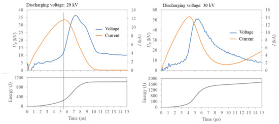 Profiles of discharge voltage, current, and energy injected into the graphite strip.