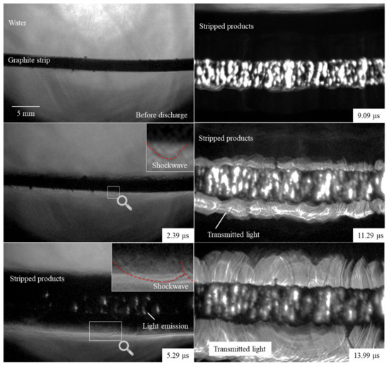 The images of the explosion of the graphite strip, at a typical time for a discharge voltage of 20 kV, is shown in Figure 3. The expansion of the graphite strips began immediately after the start of the discharge. The graphite strips contain a large amount of nitrogen gas. The electrical energy injected into the graphite strip was not sufficient to achieve a change in the state of the graphite strip. Therefore, the expansion of the strip was due to the thermal expansion of the gas. In the image taken 2.39 µs after the start of the discharge, numerous small arc-shaped shock waves are observed. This indicates that the gas inside the sample was rapidly heated, resulting in expansion and explosion. The black expansion zone blocked the light transmitted from the laser. When the electrical resistance started to increase, light emission was observed in the black expansion band (5.29 μs). When the nitrogen atom recombines, it transitions from the higher energy level B3Πg to the lower level A3Σu. This is a molecule-to-molecule transition, and the light emission spectrum is band-like (500–800 nm) [40]. It is to be noted that this wavelength region covers the band-pass filter attached to the camera lens. In other words, the light-emission region in the image shows nitrogen molecules in the transition process. In the image captured at 9.09 μs, when the energy injection was completed, the current path was observed to be occupied by nitrogen molecules. The increase in electrical resistivity can be attributed to the removal of conductive graphite from the current path. In the image captured at 11.29 µs, interference fringes of transmitted light (laser light) and shock waves are observed around the expanding gas, and the region of transmitted light is enlarged at 13.99 µs. As the transparency of water as a medium increases, the laser light is transmitted. Therefore, we can conclude that the black expansion band corresponds to exfoliated single-or few-layer graphene. A similar phenomenon was observed at an earlier time for a discharge voltage of 30 kV. We believe that the recovery of graphene increases under higher voltage conditions because the gas inside the sample can be heated and exploded more quickly. In fact, in our previous studies, the recovery of thin graphene was higher under high-voltage conditions [30]. The videos of explosion at each condition are provided in the Supplementary Materials (Videos S1 and S2).