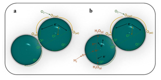 For transition metal oxides, multivalent ions or doping asymmetry can contribute to various electrical properties, e.g., insulating, semiconducting, or metallic, involving different defect types [31,32,33]. It can be observed in Figure 3a that the EIS plots exhibit mixed electron–ion conducting properties with ionic conductivity as the dominant one. Particularly, the oxygen vacancy defects are speculated as a primary factor in this LCF material. As demonstrated, oxygen molecules are primarily absorbed and transported along the surface of particles, and then they are catalyzed and reduced into ionic or atomic oxygen species. Subsequently, these oxygen species are transferred through two pathways, along the surface or cross the bulk, into the neighboring particles. In this process, the transport of oxygen ions might be enhanced by the movements of electrons. It has been proved that the ion conduction can be significantly improved for an ionic conductor by compositing with another phase, e.g., carbonate, semiconductor, even insulating conductor [34,35,36,37]. Similarly, the mixed electron–ion conducting LCF material has synergetic enhanced mobility of ion transfer by electron transport. As reported by Lan and Tao, layer-structured oxides have great potential for proton transport [20]. The proton exchange is expected in the layered LiCoO2–LiFeO2 composite. Particularly, the interfaces between the LiCoO2 and LiFeO2 phases possibly enhance the proton transfer. The proposed oxygen and proton species transport pathways in the LiCoO2–LiFeO2 composite are illustrated in Figure 4.