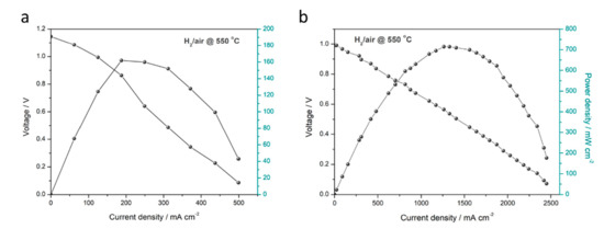 Furthermore, we explored the functionalities of the LCF as the cathode in conventional SOFC and core component in SBFC technology. As a typical mixed electronic and ionic conductivity material, LCF is considered to function as a cathode in a conventional fuel cell device with SDC as an electrolyte. The I–V and I–P characteristics of this fuel cell pellet operated at 550 °C are presented in Figure 6a. As observed, a high OCV of approximately 1.1 V is achieved, and the maximum power density reaches up to 162 mW cm−2. The considerable OCV indicates that LCF has a good catalytic property for oxygen reduction reaction (ORR) in the oxygen-input region. However, a relatively low current density is recorded. This can be attributed to the low electronic conductivity of LCF as cathode. Compared to the conventional device, the SBFC with a simplified configuration (Cell III) exhibits a comparable OCV of around 1 V, and the corresponding peak power density is 714 mW cm−2 (see Figure 6b). The significantly enhanced fuel cell performance (4.4-fold improved power density over that of conventional fuel cell device) profits from the SBFC and LCF can function as a core semiconducting ionic-conducting component in this technology. These findings expand the layer-structured LCF heterostructure composites into both conventional SOFC and recent-emerging SBFC technology.