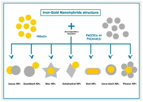 Depending on their use, iron–gold NPs can be designed in various structures. The appropriate particle structure can be obtained by different factors, including particle shape, size, and chemical composition. The most desired morphologies of the iron–gold NPs include core–shell, dumbbell-shaped, Janus-shaped, flower-shaped, star-shaped, octahedral-shaped, and rod-shaped, as depicted in Figure 2. The synthesis of these morphologies, shape, and final performance depends on their junctional mode and interfacial morphology of the heterodimer structures [74].