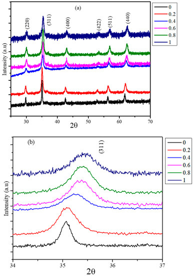 3.1. XRD of CoxMn1-xFe2O4 (x = 0, 0.2, 0.4, 0.6, 0.8, and 1.0) Nanoparticles