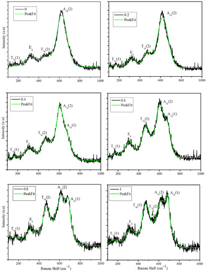 Raman spectra of CoxMn1-xFe2O4 (x = 0, 0.2, 0.4, 0.6, 0.8, and 1.0) nanoparticles (the composition and fitting of the peaks are marked in the figures; the green line indicates the peak fitting).