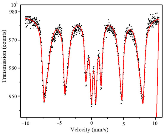 Room temperature Mössbauer spectrum of Co0.2Mn0.8Fe2O4. The dots represent the experimental data and the red solid line represents the fitting.