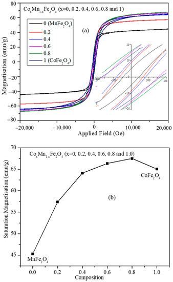 Magnetic hysteresis (MH) loops obtained for the mixed ferrite nanoparticles are shown in Figure 5a. The magnetic hysteresis loops were obtained at room temperature by applying a magnetic field in the range of −2.0 T to +2.0 T. The MH plots show that the nanoparticles possess a significant coercive field (Hc) and remnant magnetization (Mr) at room temperature; the values for all the compositions are listed in Table 3. These values show high composition dependency; the nanoparticles of composition Co0.2Mn0.8Fe2O4 have the highest remanent magnetization (16.05 emu/g) and coercive field (382.6 Oe). For the other compositions (x = 0.4, 0.6, and 0.8) of mixed ferrite nanoparticles, remanent magnetization and coercive field decrease with the increase of cobalt concentration. The CoFe2O4 nanoparticles possess the least remanent magnetization and coercive filed of 5.07 emu/g and 90 Oe, respectively. The saturation magnetization values (Figure 5b) show a non-monotonic behavior as a function of composition. This can be attributed to the change in site occupancy of cations in tetrahedral and octahedral positions as indicated by the Raman spectra. The trends of the remanent magnetization and coercivity values obtained from the hysteresis loops of Figure 3a can be attributed to the average crystallite sizes of the CoxMn1-xFe2O4 (x = 0.0, 0.2, 0.4, 0.6, 0.8, and 1.0) nanoparticles. The average crystallite sizes of the nanoparticles have similar trends to those of the remanent magnetization and coercive field.
