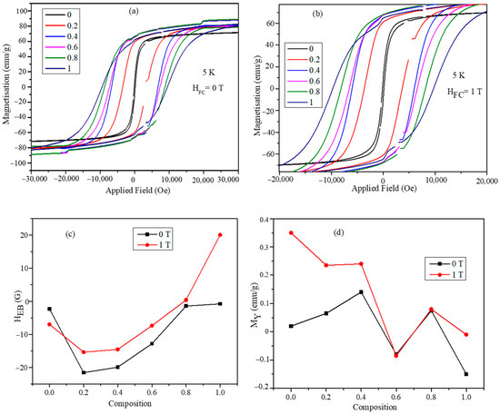 The magnetic hysteresis loops obtained at temperature 5 K (a) under zero field cooled (ZFC) condition and (b) under 1 T field cooled condition. (c) The exchange bias field as a function of composition at temperature 5 K under several field cooled values 0 and 1 T. (d) The vertical hysteresis loop shifts as a function of temperature at ZFC and 1 T field cooled conditions (lines in (c,d) are just guides for the eye).