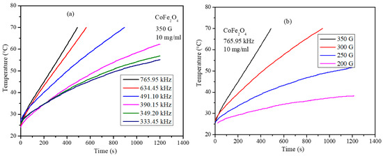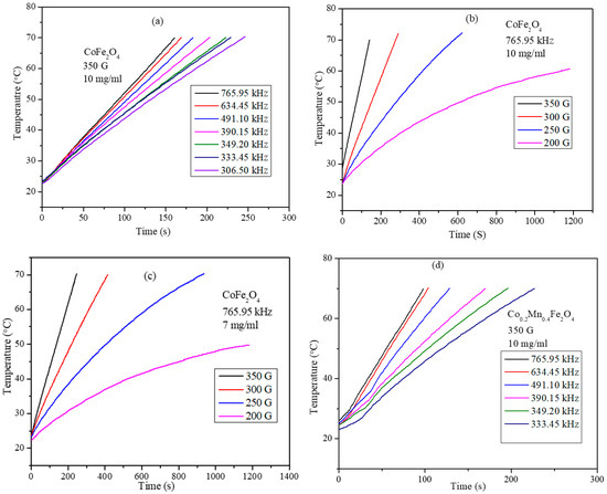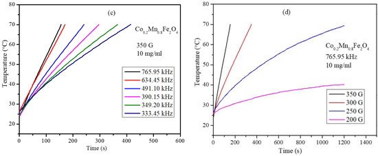 Magnetic hyperthermia efficiency of the PEG-coated mixed ferrite nanoparticles was obtained using a nanoscale Bio magnetics instrument. Heating profile curves were obtained for the CoxMn1-xFe2O4 (x = 0.0, 0.2, 0.4, 0.6, 0.8, and 1.0) nanoparticle concentrations of 3, 5, 7, and 10 mg/mL at frequencies of 765.85, 634.45, 491.10, 390.25, 349.20, and 333.5 kHz and field strengths of 200, 250, 300, and 350 G. The heating profiles of PEG-coated CoFe2O4 and Co0.2Mn0.8Fe2O4 nanoparticles are shown in Figure 6a–d. To study the effect of field frequency and strength on the heating ability of the nanoparticles, heating profiles are obtained by keeping field strength constant at 350 G, while the frequency was varied between 333.5 and 765.86 kHz. To study the effect of field strength on the heating ability, the frequency was set at 765.95 kHz and the field strength was varied between 200 and 350 G. These instrument parameters are well within the permissible levels of C = H × f = 5 × 109 Am−1s−1 (6.25 × 107 Oe Hz) for use with human trails. Heating profiles were recorded for a given concentration and field parameters until the temperature of the nanoparticle dispersion reached 70 °C [33]. The readings were taken for a maximum of 20 min exposure time when the dispersion temperature did not exceed 70 °C. The heating profiles clearly demonstrate that particle concentration, strength, and frequency of the AMF field and composition of the nanoparticle dispersion all have a significant impact on magneto thermic ability. The heating profiles are obtained using identical conditions and SAR values were determined using the initial slope of the heating curve using Equation (7).