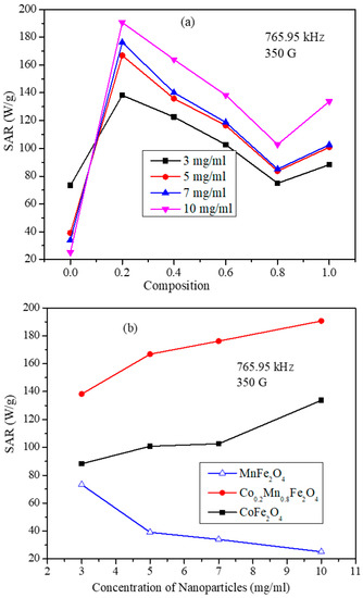 The heating profile curves displayed in Figure 7 show that, at very low frequency and field strength, the nanoparticles do not increase the temperature above 44 °C, which is the crucial requirement for the hyperthermia, such a combination of low frequency and field parameters were not used in the measurement. The heating profiles for all the compositions of CoxMn1-xFe2O4 nanoparticle were obtained under similar conditions and SAR values for the concentrations of 3, 5, 7, and 10 mg/mL obtained from the heating profiles are shown in Figure 8a. The SAR values of the nanoparticles show strong dependency on the composition of the nanoparticles. The SAR values obtained for the 10 mg/mL concentration are 765.95 kHz and 350 G field strength are 25.07, 190.61, 163.94, 138.37, 102.76, and 133.74 W/g for compositions x = 0, 0.2, 0.4, 0.6, 0.8, and 1, respectively. Although, the expected trend of SAR values might be expected to show a similar trend to that of the saturation magnetization (shown in Figure 5b). However, interestingly, the composition with x = 0.8, which has highest saturation magnetization value of 67.63 emu/g, displayed the lowest SAR values at all concentrations among mixed ferrite nanoparticles. For each concentration, the SAR value is highest for the nanoparticles with composition x = 0.2 and with saturation magnetization of 57.41 emu/g. The maximum SAR value obtained is 190.61 W/g for the sample with composition x = 0.2 and particle concentration of 10 mg/mL. The SAR values decreased with the further increase in Co2+ composition, reaching a minimum for x = 0.8, and then increased slightly for the CoFe2O4 (x = 1.0) nanoparticles. This non-linear behavior of the SAR with respect to saturation magnetization of the nanoparticles can be attributed to several factors, such as the relaxation times (Neel and Brownian relaxation), morphology, size, and size distribution. The Neel relaxation given by Equation (6) has a strong dependency on the magnetic anisotropy constant (K), which again depends on the coupling interaction of cations occupied in tetrahedral and octahedral sites through oxygen [34]. The optimum site occupancy of Co2+ in the tetrahedral and octahedral sites is required. The remnant magnetization values listed in Table 3 possess a trend similar to that of SAR of the mixed ferrite nanoparticles, except for the pure CoFe2O4 nanoparticles. The concentration-dependent SAR values of MnFe2O4, CoFe2O4, and Co0.2Mn0.8Fe2O4 nanoparticles are shown in Figure 8b. The SAR values of MnFe2O4 nanoparticles decrease non-linearly with the increase in the concentration of nanoparticle dispersion. Interestingly, for the CoFe2O4 and mixed ferrite nanoparticles, the SAR values increase with the increase in the concentration of the particle dispersions used for the measurements.