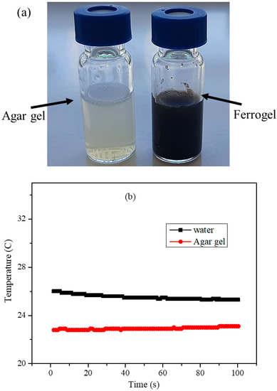 Here, 50 mg of the agarose powder was added to the 1 mL of distilled water and, to this mixture, 10 mg of PEG-coated nanoparticle was added and sonicated for 10 min. The dispersion mixture was heated to 95 °C using a water bath; upon heating for 20 min, agar dissolves in water completely and forms homogenous solution at 95 °C and, upon cooling, it forms a homogenous ferrogel. The ager hydrogel and agar-ferrite magnetic ferrogel formed upon cooling are shown in Figure 10a. From the images, it can be observed that agar gel is transparent and the nanoparticles are uniformly distributed in agar gel. The heating profiles of pure water and agar gel, shown in Figure 10b, indicate that the water and agar gel do not cause any magnetic heating upon exposure to AMF. The heating measurements were carried out with different initial temperatures.