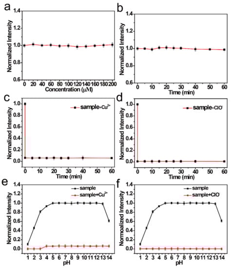 Next, the chemical and optical stabilities of the NCDs were studied. As shown in Figure 2a, no clear change was observed in the FI, which shows that an increase in the concentration of NaCl increases the salt stability of the NCDs. The FI of the NCDs was also detected under UV light (365 nm) exposure (Figure 2b). It was observed that the FI of NCDs changed little with time, implying that NCDs have good stability. When Cu2+ was added to the NCDs, the FI rapidly quenched (<1 min) (Figure 2c). The FI similarly quenched quickly when ClO− was added to the NCDs (Figure 2d). These results show that the NCDs are sensitive to both Cu2+ and ClO−. When Cu2+ and ClO− solutions of different pH were added to the NCDs, the FI of the NCDs did not show a significant change in the pH range of 4–14 (Figure 2e). Hence, it can be inferred that NCDs are not affected by the change in pH. After quenching by Cu2+ and ClO−, the NCD solution shows a good signal response to them between pH of 1 and 14 (Figure 2f).