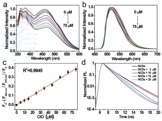 FI of the NCDs excited by (a) 311 nm radiation and (b) 497 nm radiation after adding different ClO− concentrations (from top to bottom: 0–75 μM). (c) Relationship between the F454 nm/F515 nm ratio versus the ClO- concentrations (0–75 μM). (d) Decay PL spectra of the NCDs quenched by ClO− at different concentrations.