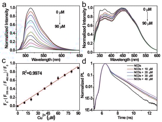 FI of the NCDs excited by (a) 497 nm radiation and (b) 311 nm radiation after the addition of different Cu2+ concentrations (from top to bottom: 0–90 μM). (c) Relationship between the F515nm/F454 nm ratio versus the Cu2+ concentrations (0–90 μM). (d) Decay PL spectra of the NCDs quenched by Cu2+ at different concentrations.