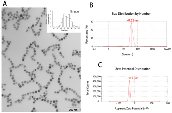The BMs were purified from Magnetospirillum gryphisiwaldense MSR-1 magnetotactic bacteria by the ultrasonic crushing method [24]. The transmission electron microscopy (TEM) was used to visualize the morphological characteristics of BMs (Figure 1A). The average diameter of BMs was about 38 nm (Figure 1A). It can also be observed that purified BMs have good dispersibility and were organized in chains. Dynamic light scattering using Zetasizer Nano ZS confirmed the size distribution of the BMs (Figure 1B), and the zeta potential of the BMs was around −30.7 mV (Figure 1C).