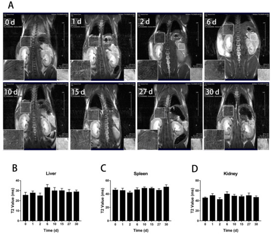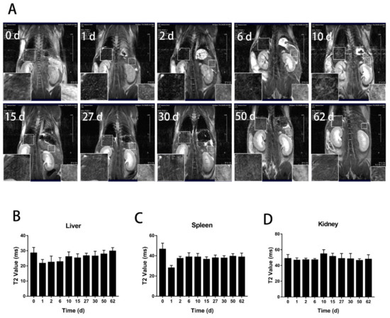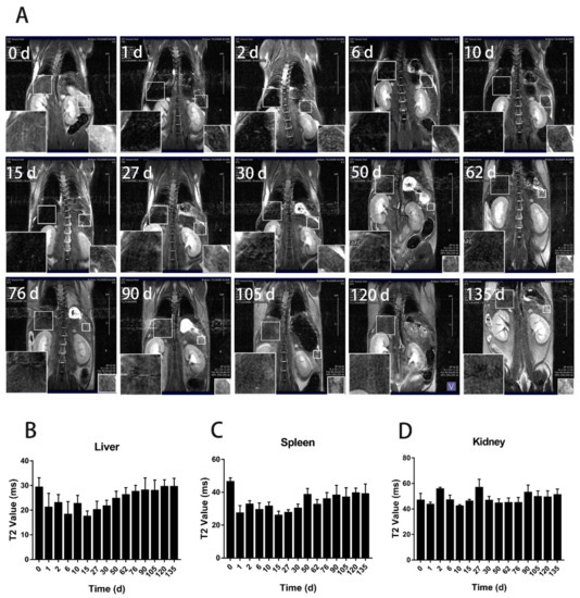 To track the distribution and clearance of BMs after tail administration, magnetic resonance imaging (MRI) was performed on mice at the designated time points from day 0 to day 62 and 135 for the low and high dose, respectively, when the transverse relaxation time (T2) nearly returned to the control level (Figure 2). The result showed that for the low dosage group (8 mg/kg, BMs), there were significant changes in the liver and spleen on the first and second days after injection. The liver signal returned to the normal level on the tenth day (Figure 3), but the spleen became normal rather quickly on the sixth day. In the high dosage group (32 mg/kg, BMs), MRI signals in the liver and spleen of mice were also changed significantly from the first day. The transverse relaxation time (T2) was the shortest at approximately day 15, indicating that the amount of BMs was mostly accumulated in these two organs. After 120 days, the signal of the liver became normal, suggesting BMs were discharged from the liver. However, T2 of the spleen returned to the control level slightly earlier than the liver, which is at approximately 90 days (Figure 4). Noticeably, there were no significant changes in the kidney in all three groups, revealing that BMs do not accumulate in the kidney. The recovery of T2 further confirms that BMs were discharged from mice.