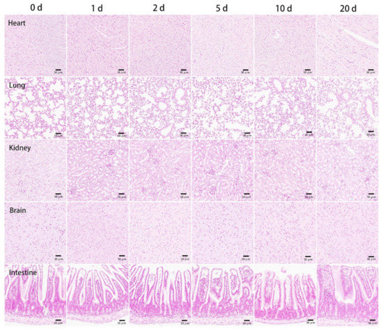 Figure 5. Prussian blue staining of the tissue ultrathin section of the heart, lung, kidney, brain, and intestine at the designated time points after tail vein injection of BMs at the dosage of 32 mg/kg. Scale bars: 50 μm.