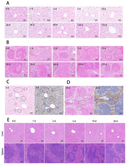 Figure 6. The liver and spleen ultrathin section staining at the designated time points after tail vein injection of BMs at the dosage of 32 mg/kg. Prussian blue staining images of the liver tissue (A) and the spleen tissue (B) were shown with scale bars of 50 μm. Comparisons between Prussian blue staining of the tissues and the immunohistochemical staining of macrophages for the liver second days (C) and spleen twentieth days (D) after BMs were injected intravenously and images were at scale bars of 50 μm. (E) HE staining of the liver and spleen tissue ultrathin sections at the designated time points after tail vein injection of BMs at 32 mg/kg. Scale bars: 50 μm.