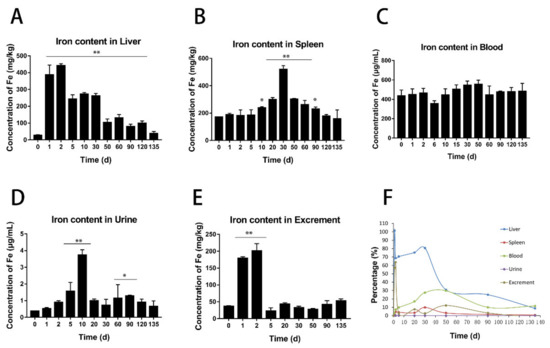 Figure 7. ICP-MS analysis of the iron content in various samples after injection of BMs at the dosage of 32 mg/kg. Changes of the iron content in the liver (A), spleen (B), blood (C), urine (D), and feces (E) and the proportion of total iron in these samples at the designated time points (F). (* p < 0.05, ** p < 0.01 means significantly different from pre-injection level.).