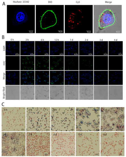Figure 8. The cellular internalization and elimination of BMs in macrophages. (A) The inter-nalization of BMs in Raw 264.7 cells. Scale bars: 10 μm. Hochest 33342, DIO, and Cy5 were taken to stain cell nucleus, cell membrane and BMs into blue, green, and red respectively. (B) The laser confocal imaging results of Raw 264.7 cells incubated with BMs of 30 μg/mL at different time intervals. The blue shows the nuclei and the green refers to proteins on the BMs membrane. Scale bars: 25 μm. (C) The Prussian blue staining of Raw 264.7 cells incubated with BMs of 30 μg/mL at different time intervals. The red shows the cell nuclei, and the blue indicates the inorganic core of BMs. Scale bars: 50 μm.