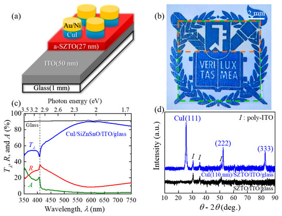 (a) A schematic structure of the p-CuI/n-SiZnSnO (SZTO) diode grown on the ITO deposited glass substrate, which was used for electrical characterization in this work. The CuI film of circular disk shape (with a diameter of 50 μm) were fabricated in two thicknesses of 140 and 20 nm while the thicknesses of SZTO and ITO films were 27 and 50 nm, respectively. Au/Ni (t = 50/5 nm) films were subsequently deposited on top of the CuI disk. (b) A separate film fabricated for optical characterization. The CuI(110 nm)/SZTO(27 nm) (the orange dashed line) were homogeneously deposited on top of the ITO/glass substrate (the green dashed line). All the regions exhibit clearly optical transparency. (c) Optical transmittance (Tλ), reflectance (R), and absorption (A) spectra of the CuI (110 nm)/SZTO/ITO/glass sample shown in (b). The black solid line represents Tλ of a glass substrate (t = 1 mm) only. (d) X-ray θ-2θ scan results of the CuI (110 nm)/SZTO/ITO/glass film shown in (b) and of another SZTO/ITO/glass film. The CuI film exhibits the preferential orientation of a (111) plane, and additional peaks represent a polycrystalline ITO film indicated as I.