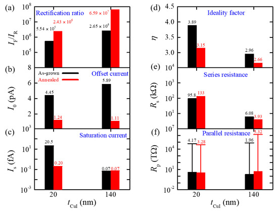Figure 3 compares all the obtained diode parameters for both CuI (20 nm)/SZTO and CuI (140 nm)/SZTO diodes before and after annealing. Here, we remind the physical meaning of each diode parameter except for IF/IR and Io already explained above. Is represents the reverse saturation current, which occurs by the minority carriers located at the depletion region of a pn diode. η describes a diode transport model; η is known to change by diffusion (η = 1), recombination (η = 2), and numerous defects region (η > 2). Rs is determined by the contact resistance of several junctions between two films and between the electrode/film, and Rp represents the parasitic parallel resistance formed by an additional leakage path. In the case of the CuI (140 nm)/SZTO diode, the annealing process results in the increase of IF/IR from 2.7 × 106 to 6.6 × 107 by ≈25 times, the decrease of Io from 5.9 to 1.1 pA, the nearly same Is being a quite low level of ≈0.07 fA, the decrease of η from 2.96 to 2.66, the decrease of Rs from 6.1 to 3.9 kΩ, and the slight increase of Rp from ≈2 to ≈5 TΩ shown in Figure 3.