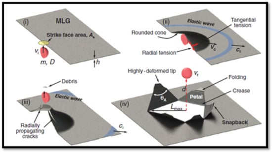 Currently, graphene-based materials are replacing the existing aramid fibre-based body armour. Multilayer graphene (MLG) is an exceptional anisotropic material due to its layered arrangement composed of two-dimensional carbon lattices. Lee et al. [] tested the MLG with microscopic projectile at extreme dynamic condition over a thickness range of 10–100 nm and found a higher strain rate of 107/s. It has been observed that MLG possesses higher specific penetration energy (10 times higher than Steel at 600 m/s). This is mainly attributed to formation of cone waves and rapid propagation in the radial direction in the graphene layers. The penetration process is illustrated in Figure 1. During penetration process a micro bullet with mass (m) and impact speed (Vi) impacts the strike face area (As) of multilayer graphene (MLG). An elastic wave propagates radially at CII followed by a conic deformation with radial speed Vc (Stage ii). Three to six cracks are initiated at the centre of As and propagates in radially outward direction resulting in the formation of the same number of petals (Stage iii). Moreover, the transferred momentum to MLG induces creasing and folding of each triangular-shaped petal while the elastic extension of the membrane is rapidly relaxed along the radial direction (Stage iv). Moreover, MLG dissipates the kinetic energy away from the impact zone. It has been suggested that the crack propagation in the polymeric composites can be prevented by incorporating multilayer graphene. Moreover, bio-inspired fabrication techniques enhance the toughness [].