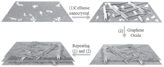 Decher et al. proposed the layer-by-layer fabrication technique for multilayer films based on electrostatic attraction mechanism. This could be achieved by alternative deposition of polyelectrolytes with opposite charges [,].The process of this fabrication technique is described as follows: (i) Initial cleaning and surface treatment of substrate; (ii) Deposition and absorption of first layer film on the substrate; (iii) Cleaning of substrate with first layer and washing thoroughly before the second layer absorption which protects the structure from pollution and maintains the stability; (iv) Submerging the substrate into the second solution to form the second layer over the first layer based on the driving force; (v) Cleaning the substrate with the first and second layers and washing again; (vi) Repeat the process ii, iii, iv, and v. Xiong et al. fabricated a high performance bio-inspired nano composites with layer by layer technique (Figure 4) using GO-cellulose nanocrystals and reported the strength and modulus are 655 MPa and 169 GPa respectively []. Presence of high concentration of surface anionic functional groups improves the effective “gluing” of CNCs to primed GO sheets via noncovalent, strong ionic interactions, and hydrogen bonding. Overall, this approach has some advantages and limitation. The main advantage of this layer-by-layer fabrication technique is precise control of hierarchical structure which provides superior mechanical and energy absorption properties. On the other hand, it is a time-consuming fabrication process.