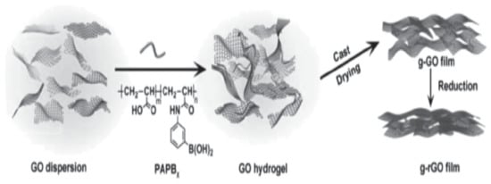 Hydrogel casting is a techno economical approach to produce bio-inspired composites. This technique is widely used to fabricate graphene-based bio-inspired polymer nanocomposites [,]. Due to the hydrophobic and hydrophilic groups on the surface of the graphene oxide nano sheets, it can swell in water and easily assemble into three-dimensional network structures. It is essential to introduce crosslinking agent while preparing graphene oxide hydrogel in order to fabricate the bio-inspired nanocomposite structure through hydrogel casting. Further, graphene oxide-based hydrogels show an excellent reversibility and lower critical gelation concentration []. The interaction between the graphene oxide nano sheets have made gelation of graphene oxide which includes electrostatic interaction, hydrogen bonding, coordination and π-π stacking [,]. It is an efficient and simple method to produce large scale hierarchical bio-inspired nano structure through different interfacial interactions [,]. Zhang et al. have developed graphene oxide/poly (acrylic acid-co-(4-acrylamidophenyl) boronic acid) (PAPBx) nanocomposites. The critical gelation concentration of PAPBx is less than 1 wt.% which facilitates the graphene oxide to form hydrogel. Formation of homogeneous bio inspired nano composite has shown improvement in mechanical properties. The GO and rGO composite films made by gel-film transformation technique illustrated in Figure 6 were named g-GO and g-rGO films, respectively. Compared to pure graphene oxide film, PAPBx based nanocomposites exhibited higher mechanical properties. However, the major drawback of this approach is precise control of bio-inspired laminated structure, which is a challenging task.