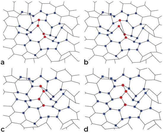 Successful bond transposition on a sample of graphene: (a) initial configuration; (b) bond transposition—atoms involved are marked with red dots; (c) local relaxation—atoms involved are marked with blue squares; (d) final configuration after global relaxation.