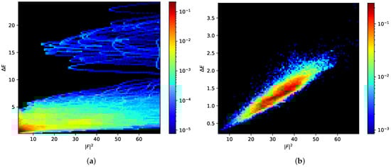 Two-dimensional histograms of the energy difference with the relaxed (final) energy and the force strength over many relaxations of a 3200 atoms sample, from the values assumed during global relaxation, (a), and at the end of local relaxation, (b). Frequency is show in logarithmic scale. We can see that the values assumed at the end of local relaxation follow the harmonic approximation of Equation (4).