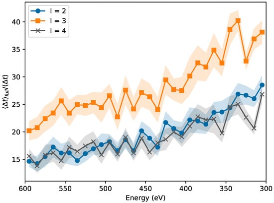 Starting from the same initial sample, we perform bond transpositions both using the usual WWW algorithm with full minimization and the early rejection method proposed here, with different values of l. The temperature is set to for both samples. After each successful bond transposition, we record the energy, the elapsed time in central processing unit (CPU) clocks, and the number of attempts since the last successful move. The simulation is stopped once the system reaches a final energy of , equivalent to . At least ten relaxation cycles are performed with the early decision method (with different values of l) and with complete relaxation after each bond transposition. As we note in Figure 4, the average CPU time per accepted bond transposition is improved by at least an order of magnitude. The speed-up grows as the sample grows larger crystalline domains and more random attempts are necessary per accepted bond transposition. The best results are obtained for , which leads to an efficiency improvement of a factor between 20 and 40.