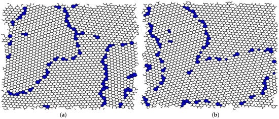 The early rejection method does not alter the amount of relaxation obtained at the end of the process. As we note in Figure 5, both the level of separation between crystalline domains, i.e., the degree to which the defects are present on the borders between them, and the size of the domains are consistent. The ring statistics of the two final configurations, computed with the Ring Statistics Algorithm (available online: https://github.com/vitroid/CountRings, accessed on 13 March 2020) [] and reported in Table 2, are also consistent. In this final configuration, the ratio of false negatives is lower than 0.5%.