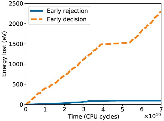Structural relaxation of a large, randomly generated sample (N = 20,000), starting from an energy of with early rejection (blue solid line) and with early decision (orange dotted line) methods. The early decision method performs significantly faster, reaching a speed-up of a further order of magnitude. We also notice a plateau around CPU cycles in the early decision line where, due to the forces accumulated from previous bond transpositions, our algorithm was incorrectly rejecting bond transpositions, slowing the evolution of the sample significantly.