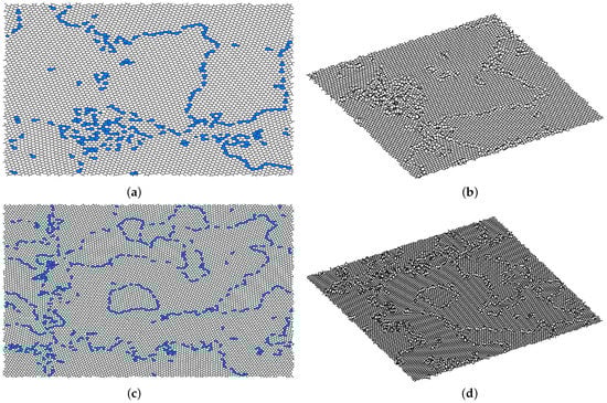 Final configurations of the 10, 024 atoms sample in two (a) and three (b) dimensions and the 20,000 atoms sample in two (c) and three (d) dimensions, obtained through early decision local relaxation with . Defects (i.e., non-hexagonal rings) are highlighted in blue in the two-dimensional plots and clearly visible due to the buckling in the three-dimensional plots. The two samples are qualitatively very similar to those of Figure 5, with large domains surrounded by defects.
