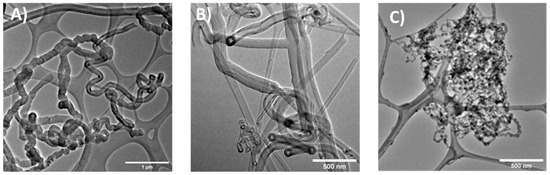 TEM images of N-CNSs: (A) Several types of individual CNT that constitute the N-CNSs; the structures formed from carbon nanotubes. (B) A T junction is clearly seen in this image. (C) Nanosponge built by the entanglement of CNTs that were not separated during sample preparation.
