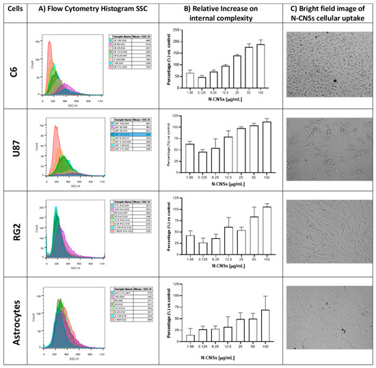 The following step consisted of the evaluation of the cell uptake of N-CNSs, which was determined through the change in cellular granularity. N-CNSs were efficiently endocytosed by astrocytic cells, including primary astrocytes and different malignant glioma cells (Figure 3). The number of N-CNSs endocytosed by these cells was proportional to the number of N-CNSs in contact with them. Flow cytometry was applied to estimate the cellular uptake of N-CNSs in C6, U87, RG2 glioma cells, and primary astrocytes through side scatter (SSC) analysis to determine the increase in the internal complexity expressed as granularity (Figure 3A). The increase in granularity was proportional to the number of N-CNSs placed in contact with the cells (Figure 3B). In addition, N-CNSs were observed inside the cells into the cytoplasm throughout the all-glioma cells and primary astrocytes, indicating their potent internalization after 48 h of incubation (Figure 3C). No morphological changes were observed, only a small dot pattern inside the cells.