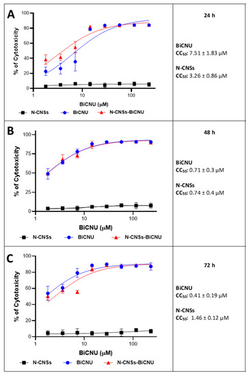 Effect of N-CNSs-BiCNU on the viability of RG2 cells at different periods. BiCNU and N-CNSs-BiCNU resulted in concentration-dependent reductions in cellular viability at 24 (A), 48 (B), and 72 h (C). Furthermore, the MTT assay showed that the treatment of these cells with BiCNU loaded in N-CNSs at 24 h resulted in a cytotoxic effect with a CC50 value of 3.26 ± 0.86 µM and BiCNU (7.51 ± 1.83 µM) (A). Similar results were observed at 48 (B) and 72 h (C) with the respective CC50 value. Plain N-CNSs did not induce cytotoxicity at the times tested.