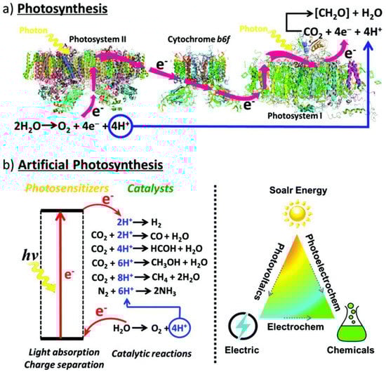 To address these issues, considerable effort has been placed on the development of renewable, environment-friendly, artificial photosynthetic technologies to sustain modern technological civilization. The use of artificial photosynthetic technology is a means to not merely mimic photosynthesis but to improve our knowledge of the process and enhance it to our selective needs through artificial means (Figure 1). Solar irradiation on our planet in just one hour exceeds our annual energy consumption. By tapping into even 0.02% of the incoming solar energy, we could satisfy all our current energy needs [7,8]. In this objective, an assortment of technologies has been developed ranging from biological systems (algae), inorganic photocatalysts (transition metal oxides or semiconductors, particularly TiO2-based catalysts), organic photocatalysts (metal-organic complexes), biomimetic systems (enzyme-activated or dye-sensitized semiconductors), tandem cells, and z-schemes to name a few [6,9].