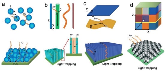 As mentioned earlier, when it comes to semiconductor photocatalysts, TiO2 remains the benchmark thanks to its relatively low cost, high availability, low toxicity, stability in both acidic and basic media, and resistance to photo-corrosion [29]. TiO2 has a wide band gap (3.2 eV for anatase and 3.0 eV for the rutile phase) and a relatively high absorption coefficient for ultraviolet photons [71]. TiO2 has a minority carrier (hole) diffusion length of 70 nm for anatase TiO2 and 10 nm for the rutile phase [72,73]. Due to its large bandgap, TiO2 primarily absorbs UV photons and taps into merely 5% of the solar energy that our planet receives. Although doping can extend the light absorption range of TiO2 from the UV to visible wavelengths, the absorption coefficient and the photocatalytic activity of TiO2 typically decrease [9,29,73,74]. To compensate for these limitations, various architectures of TiO2 photocatalysts ranging from powders in aqueous solutions [74], nanoparticles (0D), nanorods and nanotubes (1D), nanosheets and films (2D), and 0D-1D-2D integrated nanostructures (3D) (Figure 3) have been investigated [9]. 0D structures have the highest surface area per unit mass, a beneficial feature for catalysis, but have the disadvantages of not being able to sustain an internal electric field and confining both electrons and holes in a small volume of space until charge separation occurs. 1D structures combine a high surface area and the possibility of intra-nanowire charge separation due to a built-in field with the orthogonalization of light absorption/charge generation and charge separation processes [75,76]. Other efforts have focused on varying crystalline phase systems (rutile, anatase, and brookite) [77,78,79], doped heterojunctions, and mesoporous supports [80,81] with the focus being to optimize integral nanoscale properties, such as the optical path length, carrier mobility [82,83], charge carrier kinetics [84], light absorption [85], band bending, etc. Despite all of this, definitive success in sensitizing the photocatalytic activity of TiO2 to visible wavelengths is yet to be achieved.