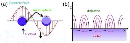 Schematic illustrations of (a) Localized Surface Plasmon Resonances and (b) Surface Plasmon Polaritons. Note the differences in morphologies of the structures involved. LSPRs are excited on metal nanostructures smaller than the electron mean free path within the material as well as smaller than the wavelength of incident light, such as the nanospheres in (a) where free electrons are displaced from the positive ions, driven by the propagating electric field component of the incident light, and oscillate collectively in resonance. In (b) the metal surface’s characteristic dimension is larger than the wavelength of incident light resulting in the excitation of a propagating surface plasmon polariton that travels along the surface with evanescent waves that diminish perpendicular to the surface. Reprinted with permission from Ref [120] Copyright Royal Society of Chemistry (2016).