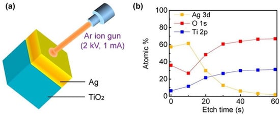 Schematic of XPS depth profile characterization. XPS and UPS are both based on the photoelectric effect, where an incident X-ray or UV photon of energy hν is absorbed by an atom resulting in the emission of a photoelectron. This photoelectron is of binding energy Eb and is ejected with a kinetic energy Ek, such that Ek = hν − Eb − φ, where h is Planck’s constant and φ is the work function. In (a) the spectra of a 10 nm thin layer of Ag on a TiO2 film is measured during etching using an Ar ion gun (at 2 kV and 1 mA) 6 times at intervals of 10 s, the result being a map of the depth profile (b) of the Ag film on the TiO2 layer where the atomic compositions are displayed in percentile measures along with their energy level occupancies [154]. Reprinted with permission from Ref [154] Copyright American Chemical Society (2014).