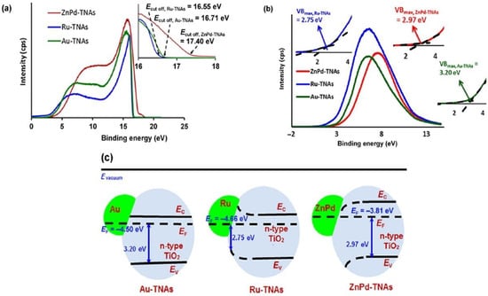 Kar et al. [155] utilized UPS to characterize band energetics in their work on enhanced CH4 yield via photocatalytic CO2 reduction using TiO2 nanotube arrays (TNAs) grafted with Au, Ru, and ZnPd nanoparticles (NP). In (a) the work functions of Au-TNA, Ru-TNA, and ZnPd-TNA are extracted to equal 4.50, 4.66, and 3.81 eV, respectively. In order to determine the positions of the valence band maxima for each structure, (b) UPS high binding energy cut-off spectra are utilized with cut-off energies at 3.20, 2.75, and 2.97 eV in Au-TNA, Ru-TNA, and ZnPd-TNA, respectively. The importance of these measurements is illustrated in (c), where the band structures of the noble metal–semiconductor composites are elucidated. Since a He laser of incident energy 21.21 eV was utilized, the work function can be calculated from the expression 21.21—Ecut-off, where Ecut-off is the cut-off energy. Given the earlier values found in (a,b), the band-bending at the NP-TNA interfaces is measured. Thus, the UPS spectra assist in the significant observation of the differing band bending dynamics that occur in TNAs in contact with Ru NPs (upward bending) and TNAs in contact with ZnPd NPs (downward bending). This is particularly helpful in facilitating hypotheses and discussions on the charge transfer dynamics that may occur in such composite systems involving metal NP co-catalysts on metal oxide semiconductor supports, and their subsequent use as potential photocatalysts for a variety of chemical reactions. Reprinted with permission from Ref [155] Copyright Springer Nature (2016).