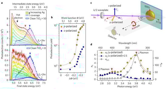 Another suite of techniques that can directly provide information regarding the inelastic decay times of plasmonic hot electrons consists of time-resolved and spectroscopic two photon photoemission (TR-2PPE and 2PPE). In noble metals and noble metals containing heterojunctions, the sequential absorption of two photons (pump and probe respectively), each with energy below the work-function of the metal, is used to generate photoemission in 2PPE. Absorption of the first photon populates an excited intermediate state with a hot carrier while absorption of the second photon provides additional energy to the hot carrier over and above the vacuum level, thus liberating it as an emitted photoelectron whose energy is measured Figure 10. By changing the time delay between the pump and the probe pulses (TR-2PPE), energies of the emitted photoelectrons correspondingly change and the dynamics of hot carriers in the excited state can be observed [159]. It is critical in TR-2PPE experiments to create excited state populations of less than 10−3 carriers/unit cell in order to eliminate contributions toward inelastic decay from hot carrier–hot carrier scattering so that the time domain decays are characteristic of scattering of the hot carriers by cold electrons below the Fermi level [160]. This is achieved by limiting the intensities of the pump and probe pulses to the low µJ cm−2 range. Tang et al. [161] formed Ag nanoparticle islands on monocrystalline rutile TiO2 surfaces by electron beam evaporation and then used 2-PPE to probe hot electrons in the resulting heterojunctions. Tang et al. [161] discovered strong coupling between the 3.03 eV excitonic transition of TiO2 and the Mie-type surface plasmon in the Ag NPs, resulting in direct generation of hot electrons in TiO2 due to dephasing of the surface plasmon caused by chemical interface damping (Figure 11). The same study also found a rutile crystal plane dependence on the hot electron generation as well as an anisotropy (depending on optical polarization parallel or perpendicular to the substrate) in the hot electron distribution.