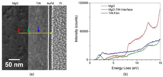 Using a combination of EELS with Scanning Tunneling Electron Microscopy (STEM) high-angle annular dark field (HAADF) imaging, Herzing et al. [168] determined the plasmon resonance characteristics of refractory TiN thin films. The spectra were collected by traversing (a) the yellow line from the MgO substrate through the TiN thin film, and to the opposite protective Pt layer. The spectra (b) are integrated over ten pixels at the locations of each colored arrow and indicate the local inelastic scattering distribution at said locations. From this, the spectral features typical of the MgO substrate are noted with an increase in inelastic scattering at 7.5 eV. At the interface of the MgO, and TiN film, a sharp peak due to surface-plasmon scattering is observed. A bulk plasmon resonance is identified at 2.81 eV and a weaker surface plasmon resonance peak was detected at 2.05 eV. The results are further supplemented by comparisons to finite difference time-domain simulations based on the measured optical data, which provide bulk and surface plasmon resonances with reasonable agreement at 2.74 eV and 2.15 eV, respectively. Reprinted with permission from Ref [168] Copyright Elsevier (2016).