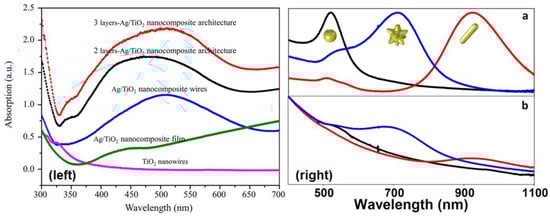 One application of plasmonic photocatalysis is to help extend the optical absorption capabilities of semiconductor photocatalysts, such as TiO2 (that largely absorb in the UV-Vis range) to visible photons. LSPR peaks in the visible spectral range for various cross-architectures of Ag/TiO2 plasmonic nanostructures (Left), as utilized in the work of Zhao et al. [176] Reprinted with permission from Ref [176] with attribution and adherence to Creative Commons Attribution License (CC BY) 4.0. Similarly, Castillo et al. [177] present (Right, (a)) the UV-vis-NIR spectra of free Au nanoparticles of varying structures from nanospheres (black), nanostars (blue), and nanorods (red), along with that of the UV-vis-NIR spectra of the same Au nanoparticles after they are adsorbed onto SiO2 beads following coating with TiO2 nanoparticles: SiO2@Au nanospheres@TiO2 (black), SiO2@Au nanostars@TiO2 (blue), and SiO2@Au nanorods@TiO2 (red). Thus, they are able to identify the unique absorption signatures of the three different morphologies along with a host of other properties including the locations of plasmon modes as evidenced by the peaks, and the fact that the UV-vis spectra of the composite structures (Right, (b)) display strong absorption bands at longer wavelengths. Reprinted with permission from Ref [177] Copyright American Chemical Society (2016).