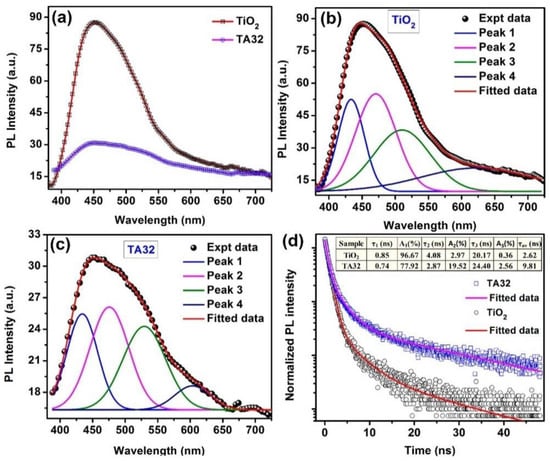 Photoluminescence is a useful technique to probe electronic interactions in plasmonic nanostructures, including the nature of defects, kinetics of charge recombination, and the migration of photogenerated charge carriers, as presented in the work of Paul et al. [194] (a) shows a comparison of PL spectra of pure TiO2 with that of the composite Ag–TiO2 excited using a 355 nm laser. It is noted that the PL intensity is highly reduced in the heterostructure, due to the introduction of Ag nanoparticles. Gaussian fitted PL spectra of TiO2 nanorods and the Ag–TiO2 heterostructure are respectively shown in (b,c). The PL intensity of the TiO2 nanorods is also seen to have decreased by ~3 times after decoration by Ag nanoparticles, while the PL spectra remain the same. By identifying the centers of the deconvoluted peaks in (b,c), Paul et al. are able to elicit the different characteristics of the given samples, such as self-trapped excitons at the TiO2 octahedra (Peak 1), shallow traps involving Ti3+ states below the conduction band (Peak 2), deep trap states associated with single electron trapped oxygen vacancies (Peak 3), and an intrinsic defect (Peak 4). Lastly, (d) provides a comparison of time-resolved photoluminescence spectra of pure TiO2 nanorods and the Ag–TiO2 heterostructure at 471 nm (emission) with 375 nm excitation. From this the lifetime of charge carriers in the different samples can be measured. Reprinted with permission from Ref [194] Copyright American Chemical Society (2017).