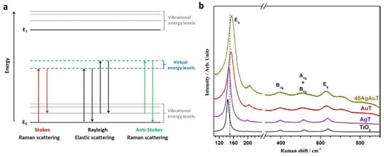(a) Schematic of the Raman effect as utilized in Ember et al. [204] The shifting modes of inelastic scattering often evinced in Raman spectroscopy from the Stokes band (Left), where an inelastic vibration is excited to the anti-Stokes band (Right), where an already excited vibrational state is de-excited, the latter resulting in a higher energy photon being emitted as opposed to the former. Lastly, is the case of the Rayleigh band (Center) where the light scattered by the sample is done so without any loss of energy. Reprinted and adapted with permission and no modifications from Ref [204] with attribution and adherence to Creative Commons Attribution License (CC BY) 4.0. Copyright Nature Publishing Group (2017). (b) Raman spectroscopy as a characterization method. Raman studies of TiO2, Ag–TiO2, Au–TiO2, and Ag on Au–TiO2 composites. As discussed in Patra et al. [205], active Raman modes at particular wavelengths allow for the confirmation of the characteristic features of anatase TiO2, as well as the confirmation of SERS resulting in frequency shifts between SERS and normal Raman spectra of molecules observed in the peak shifts and broadening after deposition of gold on TiO2 for the differing composite systems. Reprinted with permission from Ref [205] Copyright John Wiley and Sons (2016).