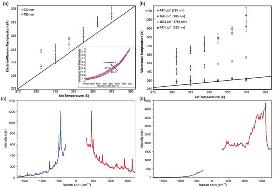 An example of the significance of SERS in analyzing hot electrons comes from the recent work accomplished by Linic et al. [117,144] In the vast literature on hot electron induced plasmonic photocatalysis, the focus has largely been on analyzing wavelength and intensity dependent Stokes SERS intensities of the adsorbed molecules on the plasmonic metal nanoparticles. Linic et al. were able to obtain unique insights by analyzing anti-Stokes intensities for a case study on methylene blue (MB) molecules adsorbed on Ag nanocubes. Using laser sources with photon wavelengths of 532 and 785 nm, Linic et al. used the anti-Stokes and Stokes SERS methods to simultaneously measure the vibrational temperature of the plasmonic nanoparticle and the attached adsorbate (Figure 19). This allowed them to track the flow of excited charge carriers in the system as the charge flow is directly related to the temperatures of the probe molecule and the plasmonic nanoparticles. Surprisingly, their experiments showed that charge transfer between the nanoparticle and the adsorbate took place under excitation by 785 nm photons as opposed to 532 nm photons, followed by selective heating of the molecule. This is a relevant result when one considers that the lowest energy of photons absorbed by free MB molecules is ~665 nm, providing further proof that the charge transfer is interfacial in nature (metal to molecule) as opposed to intraband transfers within the MB molecule. In an attempt to explain these charge transfer processes, Linic et al. were able to highlight the discrepancies in the conventional theory which would suggest higher rates of charge transfer for the 532 nm laser due to the higher energy photons involved as well as the higher extinction coefficient for the Ag SERS substrate at 532 nm compared to 785 nm. These results supplement other observations that have confirmed discrepancies in the application of the conventional theory of metallic surfaces applied to studies of LSPR phenomena [123,134]. Furthermore, the unique approach of using the anti-Stokes intensities to gauge these results is unprecedented, and only proves to signify the efficacy of SERS as an excellent technique to examine LSPR and hot electron transfer processes.