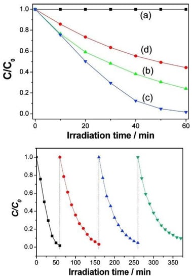 - Yu, J.; Dai, G.; Huang, B. Fabrication and Characterization of Visible-Light-Driven Plasmonic Photocatalyst Ag/AgCl/TiO2 Nanotube Arrays. J. Phys. Chem. C 2009, 113, 16394–16401. [Google Scholar] [CrossRef]