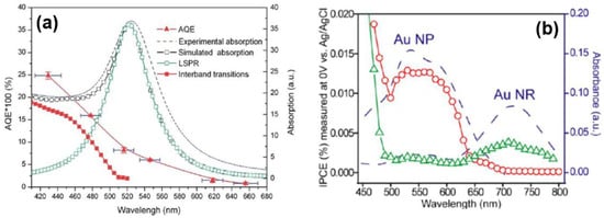 PL applied to observing hot electron phenomena would assist in probing the ultrafast relaxation processes of LSPR dephasing particularly with regards to interband and intraband scattering and transitions [60,189]. Note, knowledge of the type of transition, either interband or intraband, provides another means to distinguish between Drude and hot electron phenomena. PL also allows us to study the band structure of the relevant plasmonic structures considered, namely plasmonic metal–semiconductor Schottky junctions [189,190,191]. (Figure 16) The PL quantum yield of bulk metallic gold films under ultraviolet excitation is 10−10, which rises to 10−6 in spherical Au NPs, 10−4 in Au NRs and 4 × 10−2 in Au nanocubes [59]. The higher PL efficiency in plasmonic Au nanostructures is attributed to an accelerated radiative decay process due to the enhanced local field associated with the LSPR with sharp angled structures, such as nanoprisms, nanocubes, and nanostars, providing hot spots exhibiting the highest local field enhancements “lightning rod” effect. The emission mechanism in Au NPs is currently understood to involve an interband transition, namely the non-radiative recombination of sp-band electrons with d-band holes to emit particle plasmons that subsequently radiate [192,193].